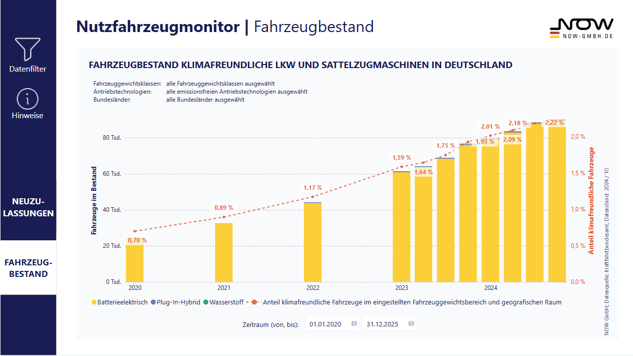 How is electric mobility developing in Germany? What is the stock of climate-friendly vehicles and how many are newly registered each month? How economical are alternative drives compared to conventional solutions? On this page you will find interactive dashboards with current figures and analyses on climate-friendly mobility. Whether electric cars, electric trucks, Total Cost of Ownership (TCO) for commercial vehicles or evaluations of funding programs – our data visualizations offer a transparent insight into the status and dynamics of the transport transition.