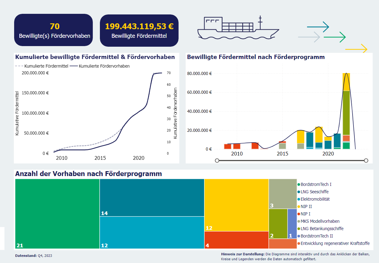 Our dashboards show the development of approved funding and funding projects and provide information on the impact of the funding measures: for example, through CO₂ savings potentials.