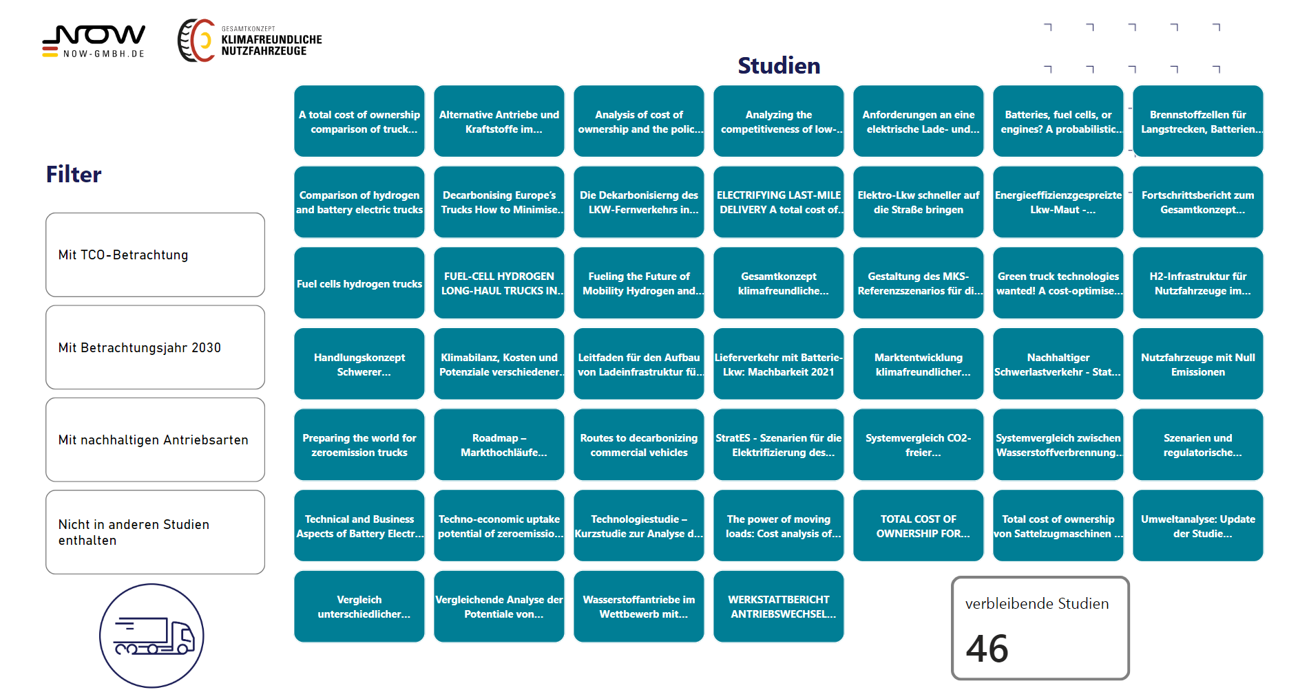 In order to obtain an overview of the range of existing TCO analyses and studies, EMCEL GmbH has prepared a meta-study on behalf of NOW GmbH. For the target year 2030, condensed statements from the meta-study are presented in the following (three) data stories. The aim of the meta-study and the associated analysis is to summarize the different assumptions and numerical values of all selected studies and to classify the values among each other for the target year 2030 – i.e. to set a framework for the forecasts of TCO values for climate-friendly commercial vehicles in the target year 2030.