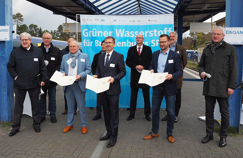 The Minister brought a total of around 25 million euros in funding support with him, which he handed over to the three project sponsors ENERTRAG, Niederbarnimer Eisenbahn (NEB) and Kreiswerke Barnim. With this support, the three partners, who have been involved in the region north of Berlin for many years, intend to set standards in the development of a regional hydrogen infrastructure and sustainable mobility in local rail passenger transport. “By operating hydrogen-powered vehicles, noise pollution can be reduced and carbon emissions avoided in regional transport,” is how Detlef Bröcker, CEO of Niederbarnimer Eisenbahn, explains the core objective of the project. “The ‘green’ hydrogen is not only produced entirely from locally sourced, renewable energy, but also enables entirely emission-free regional passenger transport on the Heidekrautbahn across the entire value chain.” The NEB will receive funding of around nine million euros to be able to operate six hydrogen fuel cell trains on the RB27 regional railway line from December 2024. “The hydrogen trains increase the appeal of regional rail transport for commuter transport and tourism, and contribute to the expansion of environmentally friendly, green mobility in the region,” adds Bröcker. “The simultaneous reactivation of the main line of the Heidekrautbahn creates additional, outstanding synergies that can be exploited for climate protection and to promote sustainable local rail passenger transport for the region north of Berlin.”