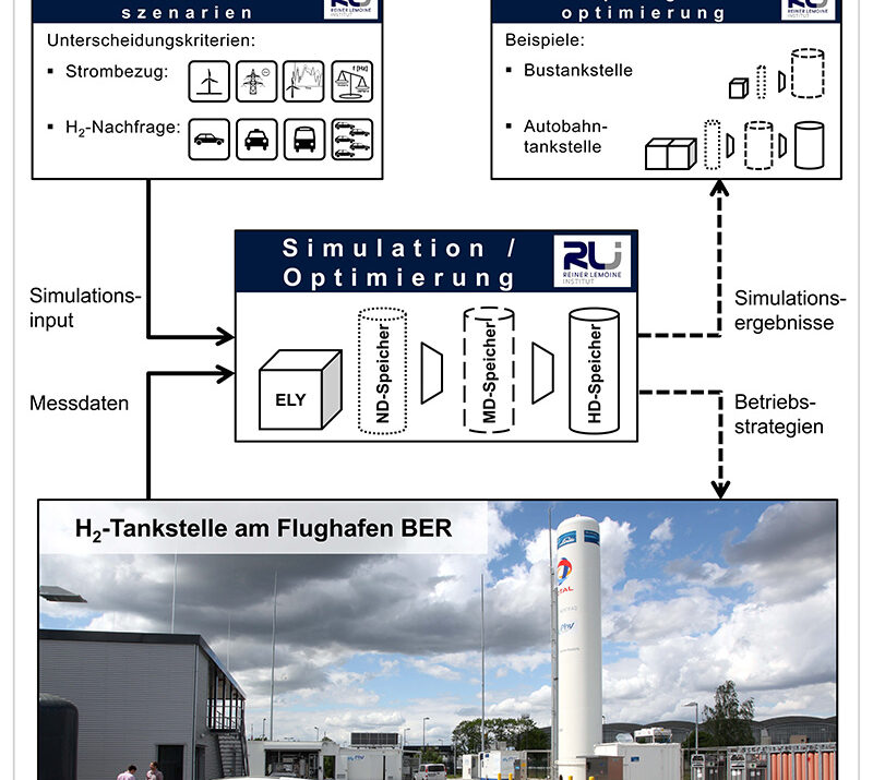 Das Reiner Lemoine Institut beforscht in diesem Projekt die Wasserstofftankstelle am zukünftigen Flughafen BER. Ziel des Vorhabens ist es, die Wirtschaftlichkeit von H2-Tankstellen mit Onsite-Elektrolyse zu verbessern, indem intelligente Betriebsstrategien entwickelt und erprobt werden. Diese ermöglichen neben dem optimalen Betrieb der Anlagenkomponenten die Berücksichtigung verschiedener Strombezugsmöglichkeiten (Erneuerbare Energien, Energie- und Regelenergiemärkte) und Verwertungspfade (Fahrzeugbetankung, Rückverstromung, Wärmeerzeugung, Belieferung von Industriekunden).