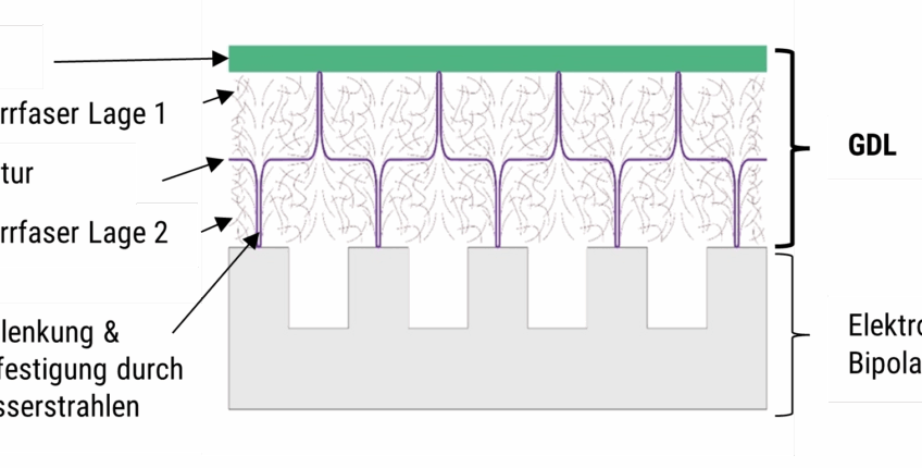 Durch den Einsatz von Faserspreiz- und Faserlegetechniken in Kombination mit der Wasserstrahltechnologie, sowie Beschichtungstechniken, sollen handelsübliche endlose Kohlenstoffasern (C-Faser) linear ausgerichtet, aus der Ebene ausgelenkt und fixiert, sowie das so entstandene Textil durch das Auftragen einer mikro-porösen-Schicht (MPL) funktionalisiert werden. Dabei kommen die anisotropen elektrischen Eigenschaften der C-Faser zum Tragen, die eine gezielte Steuerung des elektrischen Flusses ermöglichen und durch das Entfallen der kontaktbedingten elektrischen Leitung (hin zur unterbrechungsfreien Übertragung) den elektrischen Widerstand reduzieren. Der Einsatz von endlosem Fasermaterial ermöglicht zusätzlich die gezielte elektrische und mechanische Auslegung der GDL.