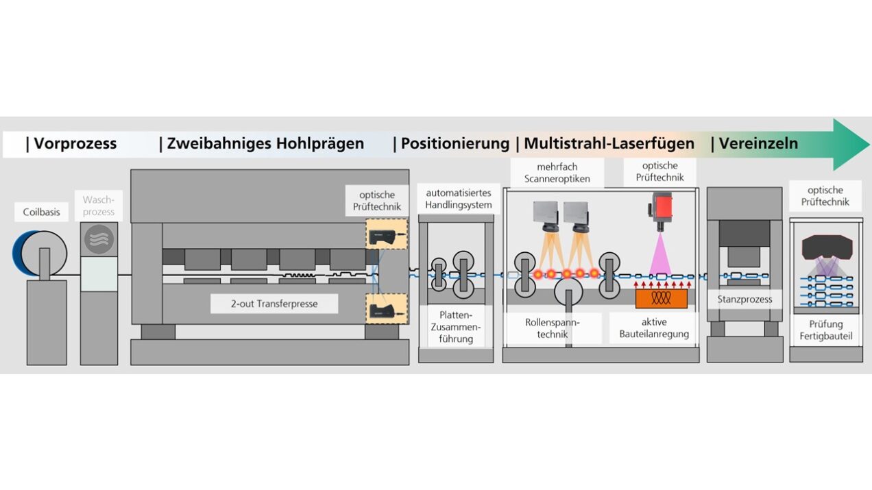 Das Verbundvorhaben KontiBIP befasst sich mit der Entwicklung von großserientauglichen Produktionstechnologien und -prozessen zur Herstellung von metallischen Bipolarplatten (aus Edelstahlfolien, s ≤ 100 µm) in einer kompletten, kontinuierlichen Prozesskette vom Coil bis zum Fertigbauteil. Die Entwicklungsschwerpunkte sind dabei die umformtechnische Herstellung der Bipolar-Halbplatten (BP-HP) sowie das stoffliche und mediendichte Fügen der zwei Halbplatten zur einer fertigen Bipolarplatte. Die Umformung der BP-HP basiert auf dem Verfahren Hohlprägen, umgesetzt durch einen mehrstufigen Schneid- und Umformprozess inklusive einer für den schnellen Teiletransport geeigneten Automatisierung. Zur Erforschung der Fügetechnologie wird das stoffschlüssige und mediendichte Fügen der kontinuierlich bereitgestellten, konturierten BP-HP durch Mehrfach-Laserremoteschweißen betrachtet. Dabei kommen mehrere, synchronisiert arbeitende Laserscanneroptiken sowie Prozessregelungskonzepte zum Einsatz. Ein Hauptschwerpunkt ist dabei die Entwicklung einer kontinuierlichen Spannmethodik zum exakten Positionieren der beiden HP-Geometrien zueinander bei sehr hoher Taktrate. Ein weiterer Schwerpunkt ist die Entwicklung von prozesskettenintegrierten Mess- und Prüfsystemen, die sowohl nach der Umformung als auch nach dem Fügen signifikante Qualitätsmerkmale erfassen und mittels geeigneter moderner Algorithmen auswerten, um so frühzeitig auftretende Fehlerbilder sicher detektieren zu können.